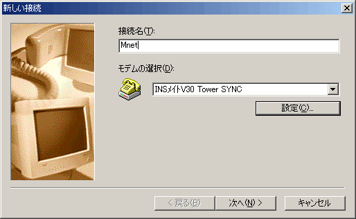 | 3.接続名『Mnet』と入力し、モデムの選択でお使いのモデム(TA)が選択されていることを確認し、次へをクリックします。 |