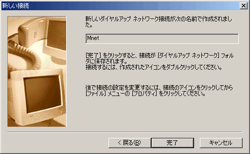 | 11.再度『ダイヤルアップネットワーク』の画面に戻りましたら、Mnetのアイコンをダブルクリックします。設定を確認し、問題なければ『接続』をクリックします。 |